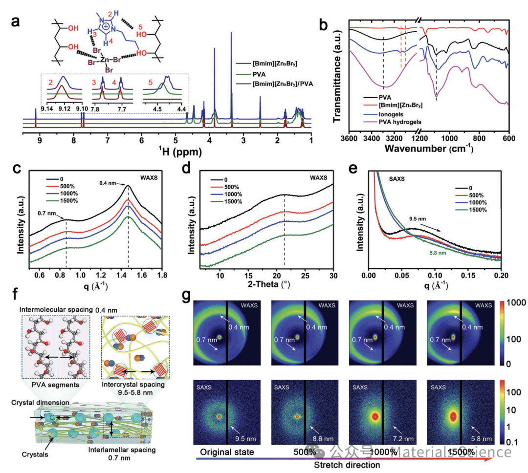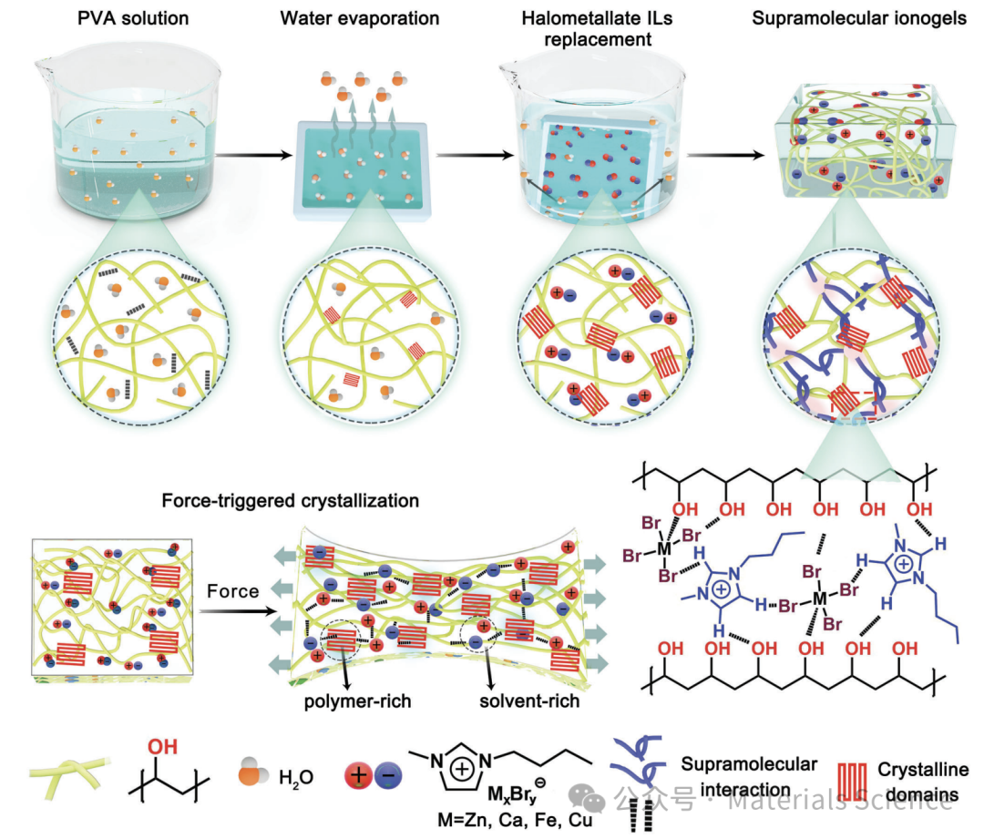 将PVA粉末(5g)和水(20g)的混合物彻底搅拌并加热(95°C)2小时,以获得PVA(20wt%)的分散体。将制备好的溶液倒入硅胶模具中,在室温下蒸发水,得到含水量为40 wt%的PVA水凝胶。可结晶超分子离子凝胶的合成:采用溶剂交换策略制备了超坚韧的可结晶超分子离子凝胶。将制备的水凝胶浸泡在卤金属酸盐离子液体中24 h,离子液体置换两次,保证水完全置换。在溶剂交换过程中,卤金属酸盐离子液体与PVA通过配位键和氢键形成超分子相互作用。