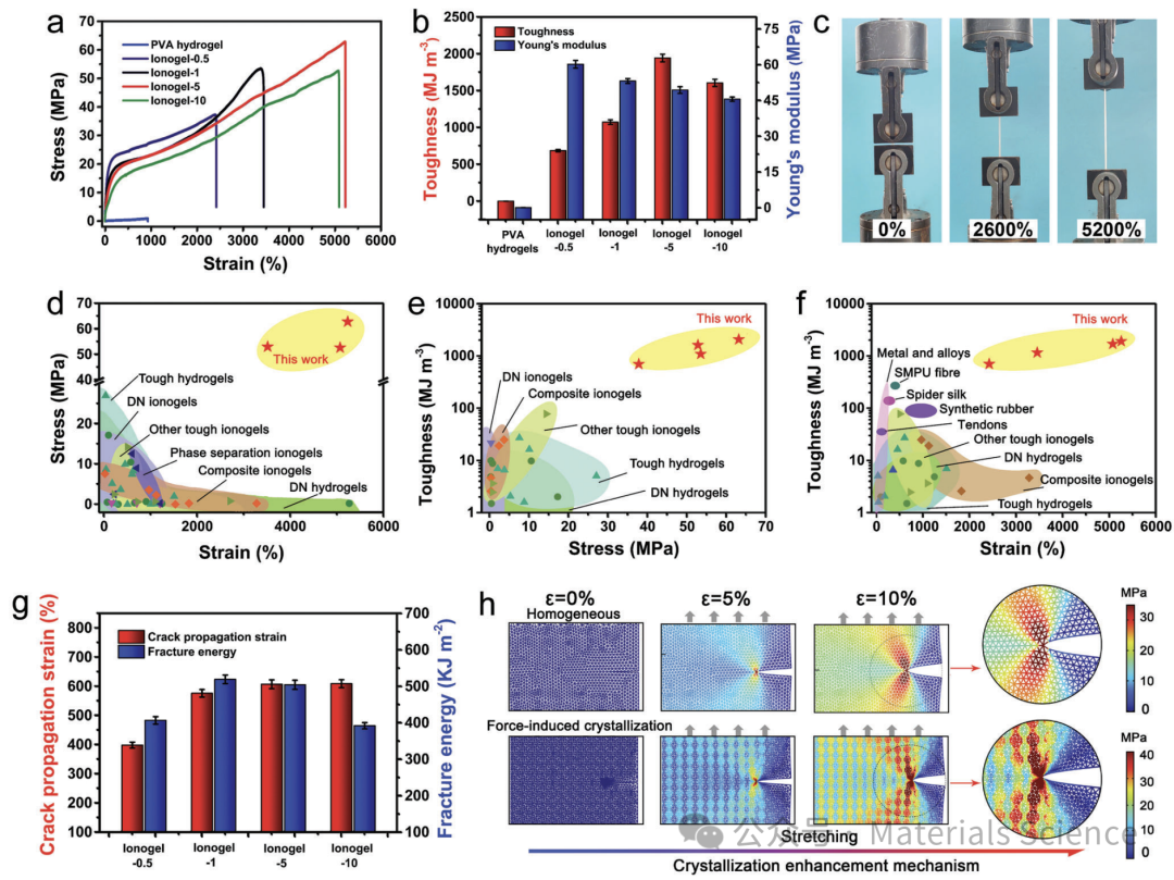 常见的天然和合成高强度材料(如橡胶、塑料、陶瓷和金属)的变形能力较差。同时实现高强度和大变形是一个巨大的挑战。本文通过力诱导结晶和卤金属化离子液体产生的超分子离子网络的协同作用,开发了高强度离子凝胶。制备的聚乙烯醇/卤代金属酸离子液体离子凝胶表现出优异的力学性能,包括极限断裂应力(63.1 ± 2.1 MPa)、应变(5248 ± 113%)和前所未有的韧性(1947 ± 52 MJ m−3),远高于大多数金属和合金。此外,离子凝胶可以实现水的可逆性,实现绿色回收和损伤力学性能的恢复。
