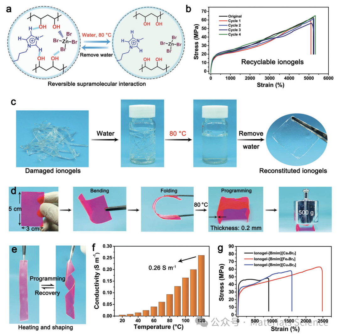 通过力诱导结晶和卤金属化离子液体产生的超分子离子网络的协同作用,开发了兼具高强度和大应变容量的可结晶超分子离子凝胶。卤金属酸盐离子液体极大地改善了溶剂/溶剂和溶剂/聚合物的超分子相互作用。制备的超分子离子凝胶表现出前所未有的韧性,甚至高于金属和合金。制备的离子凝胶不能完全替代具有高模量和强度的金属。然而,在许多应用场景中,如潮湿和腐蚀性环境,具有高韧性的离子凝胶有其优势。非共价可逆超分子物理交联网络在离子聚合物中具有优异的裂纹扩展不敏感性和可回收性。通过水回收离子凝胶促进了绿色回收,从而恢复了所有受损的机械性能。增强的机械行为、离子电导率和极端的环境抵抗力支持了所制备的离子凝胶的环境适用性和稳健性。
