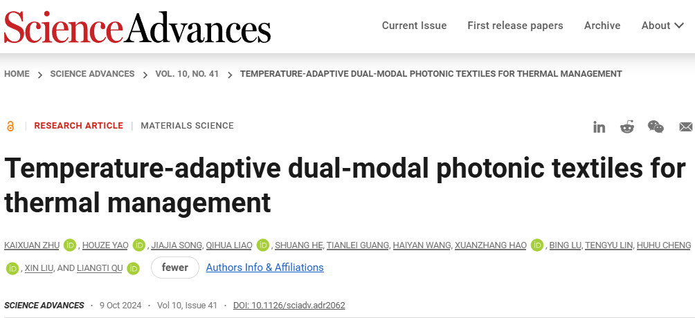清华大学曲良体教授 Science Advance 基于热致变色微胶囊的智能纺织热管理: 温度自适应双模态光子纺织品