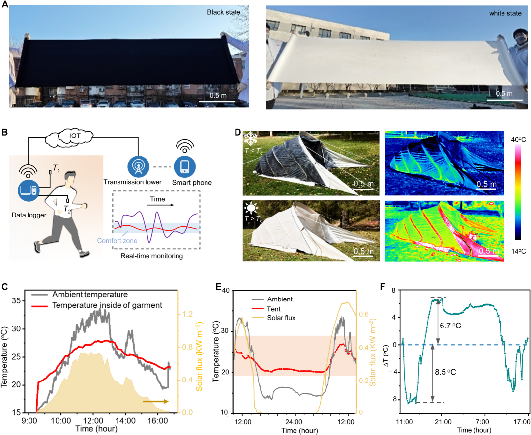 图4. 自适应智能织物(SF)在智能服装、帐篷热管理的测试