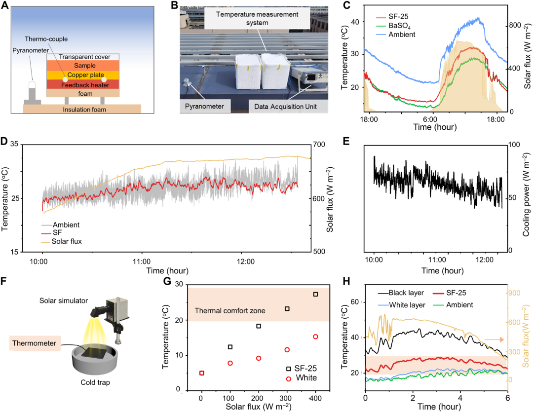 由图3可看出,在辐射冷却性能中,SF - 25和纯 BaSO₄涂层在阳光充足、环境温度较高(40.2°C)时分别比环境温度低8.2°C和10°C,显示两者有相似的冷却性能。在太阳强度为600 - 675W/m²时,环境和SF温度均随光强度增加而升高,且具有良好的温度跟踪性能。SF的辐射冷却功率在50 - 80W/m²之间,展示了SF较好的辐射冷却能力。在太阳能加热性能中,SF - 25在低温下为黑色,具有较高阳光吸收能力,在不同光强度下温度高于白色涂层。在光强度大于200W/m²时,温度达到高于人体舒适温度19°C,体现其在太阳能加热方面的性能优势。黑色涂层温度范围为28°- 42°C,白色涂层温度范围为19°- 22°C,SF- 25 温度范围为20°- 28°C,表明SF具有良好的温度调节能力。