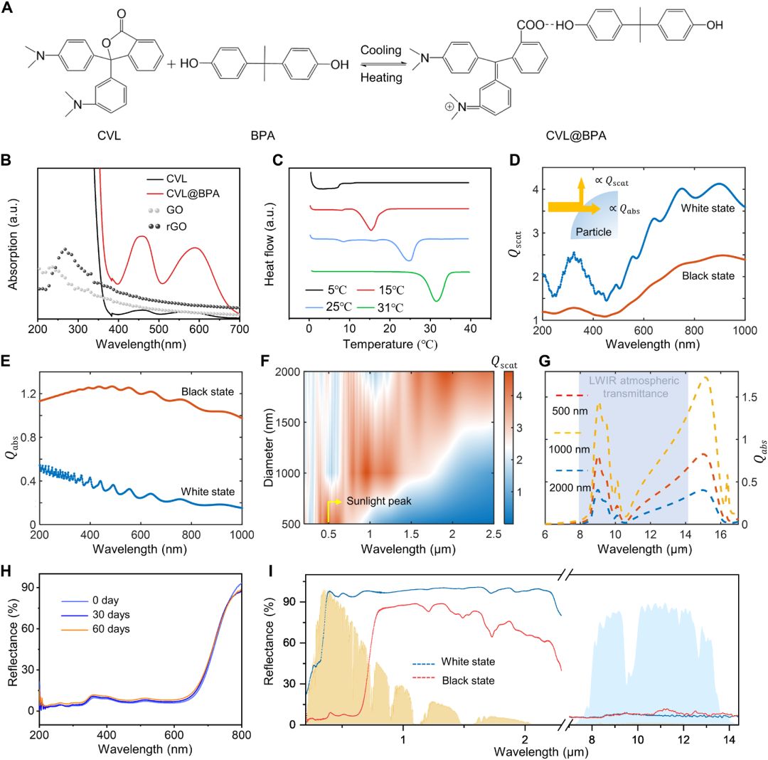 由图2中可以看出,图2A以示意图解释可逆热致变色过程机制,涉及CVL 分子结构随温度变化与 BPA形成复合物。在光学吸收特性中,CVL@BPA在可见光谱的吸光度比CVL高 11.3 倍,体现TM较高颜色调制能力;GO膜和rGO 膜分别在234nm和270nm处有吸收峰,体现材料光学吸收特性差异。在相转变温度设置中,不同温度下的TM的DSC曲线表明TM相转变温度可根据1 - 十四醇比例在一定范围内设置,如5°、15°、25°和 31°C等。在光学散射特性中,白色状态(CVL)的散射效率至少是黑色状态(CVL@BPA)的两倍,体现不同颜色状态下光学散射特性显著不同。在吸收效率展示中,黑色状态在紫外-近红外波段的吸收效率显著大于1,基本覆盖太阳光最强区域,说明SF材料在吸收太阳光方面能力强。在BaSO₄ 颗粒散射效率中,不同直径BaSO₄ 颗粒在太阳光谱范围内的散射效率Qₛcₐₜ曲线显示最优直径位于500nm附近,因其散射强度集中在300 - 700nm,与太阳峰匹配。在LWIR范围吸收效率中,500nm直径的 BaSO₄ 颗粒在 LWIR 范围内仍具有较高的Qₐbₛ(高达 0.7),增强了SF辐射冷却性能。在抗紫外线性能表现中,SF在不同紫外线暴露时间下太阳光谱中的反射率测试,结果表明 SF具有良好抗紫外线性能,在60天加速老化测试中能保持原始黑色状态99%以上性能。在宽带反射率调制测试中,展示了SF在不同光谱范围内的宽带反射率调制能力,高温时蓝色线表示黑色状态下太阳光谱高太阳反射率,低温时红色线表示白色状态下太阳光谱低太阳反射率,且在大气窗口内所有波段反射率都较低,体现材料在不同温度下的光学反射特性变化与热管理功能紧密相关。