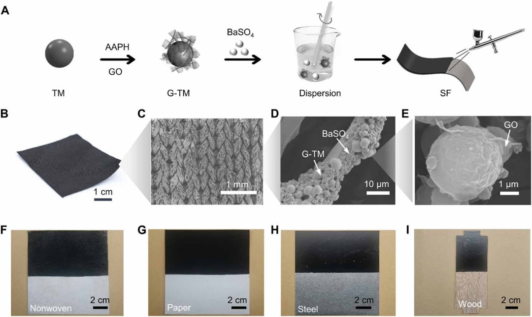 图1A展示了SF的制备过程示意图。清晰地呈现了从TM表面负载石墨烯、BaSO₄颗粒和水性聚氨酯分散液的混合物,到最终将其喷涂到织物上获得SF的过程,图1B - D分别为SF的数码照片以及不同放大倍数的扫描电子显微镜(SEM)图像。从图像可以看出,G - TM和BaSO₄颗粒均匀地分散在纤维上,这对于材料性能的一致性至关重要。图1E是石墨烯包覆TM的SEM图像,进一步展示了功能材料在微观层面的结构,表明石墨烯能够均匀地包裹在TM上,为材料的性能提供了保障。图1F - I显示了功能材料可以喷涂或涂覆在多种不同的基材上,如无纺布、纸张、钢铁和木材等,体现了SF材料的广泛适用性。