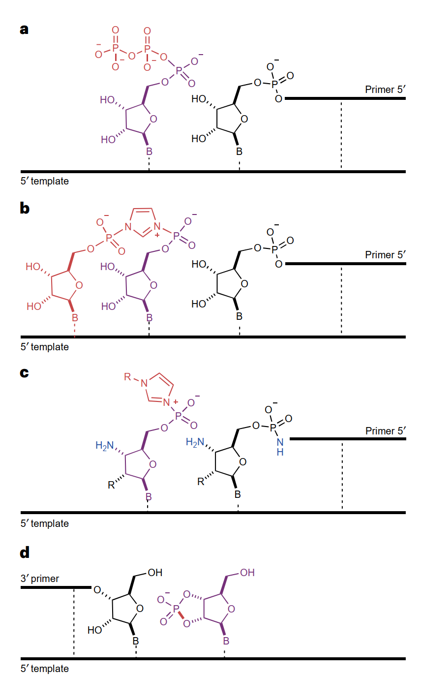 目前人们认为,核苷酸缩合反应通常具有两种主要形式:模板驱动和非模板驱动。模板驱动合成是核酸复制的基础,而非模板驱动合成是形成能够作为模板的核酸的先决条件。尽管人们已经证明在水溶液中可以有效地复制短RNA序列,但如何将遗传信息从XNA转移到DNA和RNA仍然是一个挑战。