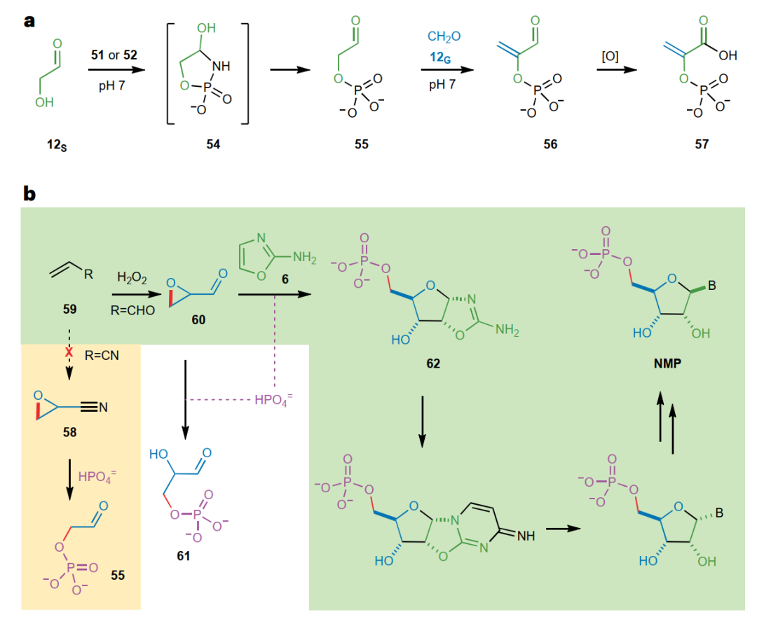 在现代生命体中,核苷酸的活化和缩合反应,特别是如何将核苷酸转化为活化的核苷酸-5'-磷酸这个过程涉及到使用三磷酸核苷(NTPs),它们结合了热力学激活和动力学稳定性,使得聚合反应可以被催化控制。然而,在非酶催化的条件下,如何实现这一步骤仍然是一个未解决的问题。