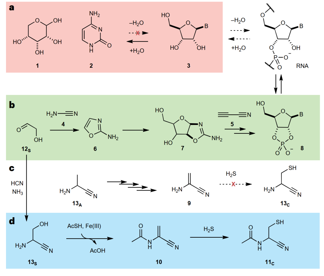 探寻生命起源是一个多层面的跨学科科学领域,其重要问题涵盖了从行星环境到达尔文进化论的兴起,再到复杂生命形式的后续演化的所有科学学科。生命普遍存在的组成成分,即进化的基础,是核酸(DNA和RNA)、蛋白原性肽和一系列辅因子。这些生命的基本分子支撑了整个已知的地球生命史,也是生命起源化学最重要的目标。然而,由于系统发育和岩石记录的侵蚀,生命的深远历史永远无法被揭示。因此,验证生命起源化学的唯一机制将是在非生物条件下形成一个类似于现存最简单生命形式的化学系统。了解保守的生化物质如何能够选择性形成,是这一过程中的关键环节。选择性,即从许多“理论上可能的”选项中生成一种分子,是生物化学的标志。与陨石中发现的非生物材料相比,生物化学产生的分子种类相对较少,而且往往具有极高的精确度。高效且选择性的化学反应对于产生足够的生命必需分子至关重要。因此,对促使生命分子形成的物理和化学因素的理解是生物化学的根源,并将最终决定启动地球或宇宙中其他地方生命所需满足的环境条件。
