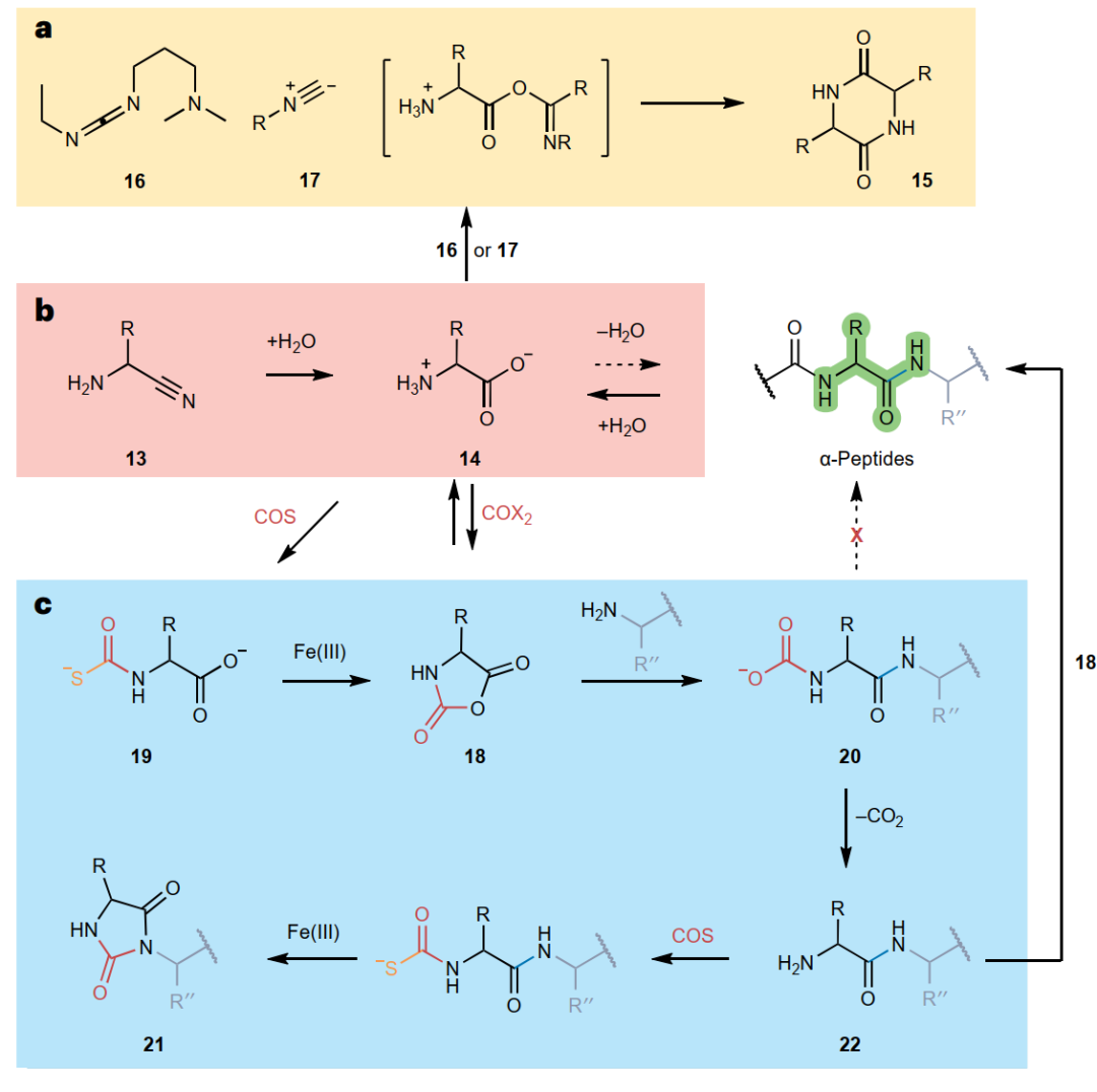 在文章中,作者首先提出了几个关键问题:在水环境中,蛋白质源性的氨基酸是否倾向于自发形成肽类化合物?在没有保护基团或进化出的催化剂的情况下,肽类的合成是否可能?肽类的合成策略是否与现代生物体内从N端到C端的肽类合成策略相似?这些问题对于理解生命起源至关重要,因为它们关系到生命分子如何在早期地球的环境中形成。