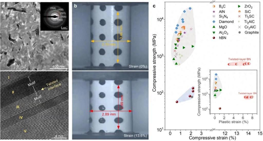 1、重大的意义:一是解决了普通陶瓷在室温下几乎无塑性,仅经历很小的弹性变形就会发生早期脆性断裂的缺陷。虽然普通陶瓷相比于金属,虽具有轻质、高强、耐高温、耐腐蚀、耐磨损等优异特性,作为结构材料已得到广泛应用,但是普通陶瓷在室温下容易发生早期脆性断裂,引发灾难性事故,这是陶瓷作为工程材料的致命弱点。而田永君院士团队研制出的塑性陶瓷能像金属那样在室温可产生变形,因为合成的转角层状氮化硼陶瓷在室温下不仅具有高强度和高塑性,还具有高的能量吸收能力和抗疲劳特性;二是通过塑性陶瓷研制中取得突破有望进一步研制出高性能的密封件、阻尼元件、防护装甲等产品;三是该研究的材料设计和合成策略可拓展到其他层状材料体系,如石墨、MAX相陶瓷等,为进一步研发其他体系的塑性陶瓷提供了启示。