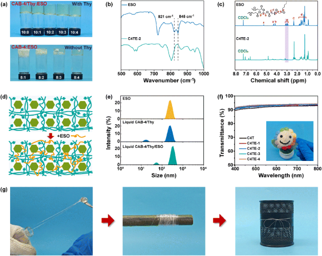 图3. 三元CAB/Thy/ESO体系的原位交联与表征。(a) 均相三元CAB-4/Thy/ESO体系(上)与不含Thy的互不相溶CAB-4/ESO对照体系(下)的混溶性对比。(b和c) 谱学证据证实交联:傅里叶变换红外光谱(b)和¹H核磁共振谱(c)显示最终C4TE-2薄膜中ESO特征环氧信号消失。(d) CAB与ESO间无催化剂、碘介导交联的拟议机制。(e) 纯ESO、CAB-4/Thy低共熔体系及CAB-4/Thy/ESO三元体系的动态光散射分析。(f) 证明C4TE-x薄膜高光学透光性的紫外-可见透射光谱。插图:典型透明薄膜照片。(g) 三元混合物熔融纺丝性能验证,拉伸后形成柔性纤维。