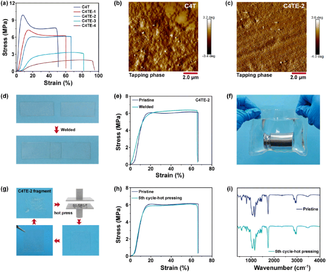 图4. C4TE动态网络薄膜的力学性能、热加工性、化学稳定性及闭环可回收性。(a)不同ESO含量的C4T与C4TE薄膜拉伸应力-应变曲线。(b和c)原子力显微镜相位图像对比:C4T的微相分离结构(b)与C4TE-2的均匀网络结构(c)。(d) 两片独立的C4TE-2薄膜可通过热封连接。(e) 未处理薄膜与热压焊接薄膜的应力-应变曲线对比,展现近100%的自愈合效率。(f) 热封制成的防水袋,展现薄膜的热加工性能。(g) 热压闭环回收工艺示意图。(h和i) 五次循环后闭环可回收性证据:(h) 叠加应力-应变曲线与(i) FT-IR光谱均表明机械性能及化学结构无降解。