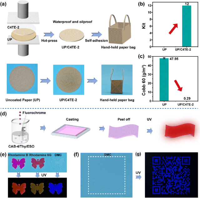 图6. C4TE系统作为先进应用的多功能平台。(a) 采用C4TE-2复合纸制成的纸袋,展现其在高性能包装领域的应用潜力。(b和c) 复合后纸张增强阻隔性能的定量分析:(b) 防油性(试剂盒测试)和(c) 防水性(Cobb 60测试)。(d–f) C4TE-2作为光学材料的强韧基质:掺杂不同荧光染料的薄膜照片,分别在(d和e)日光下及(f)紫外光下拍摄。(g)采用DMC掺杂墨水在C4TE-2基材上印刷的防伪二维码,展示环境光(上)与紫外光(下)下的效果。
