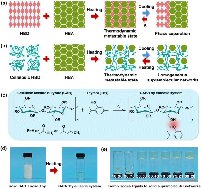 图 1. CAB/Thy聚合物-小分子低共熔体系的设计概念。(a) 传统小分子亚稳低共熔示意图,冷却时通常发生不可逆相分离。(b) 提出的聚合物-小分子低共熔示意图,其中高分子氢键供体(HBD,纤维素衍生物)与小分子受体(HBA)形成热可逆超分子网络. (c) CAB/Thy低共熔体系制备路线示意图。(d) 无溶剂简易制备法实景照片:加热CAB与Thy混合粉末可获得均匀液态低共熔混合物。(e) CAB/Thy体系在室温下的物理状态随质量比变化的光学照片。