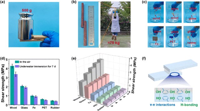图5. C4TE-2动态网络作为高性能热熔胶的应用。(a和b)粘合强度演示:C4TE-2粘合的木质接头分别承载(a)500克重物与(b)约70公斤成人。(c) 展示该粘合剂在水下环境中粘接多种基材的能力。(d) 不同基材上的搭接剪切强度,在空气中测试及经7天水浸后测试。(e) 经五次反复粘接-剥离循环后的粘合强度。(f) 多重粘合机制示意图。