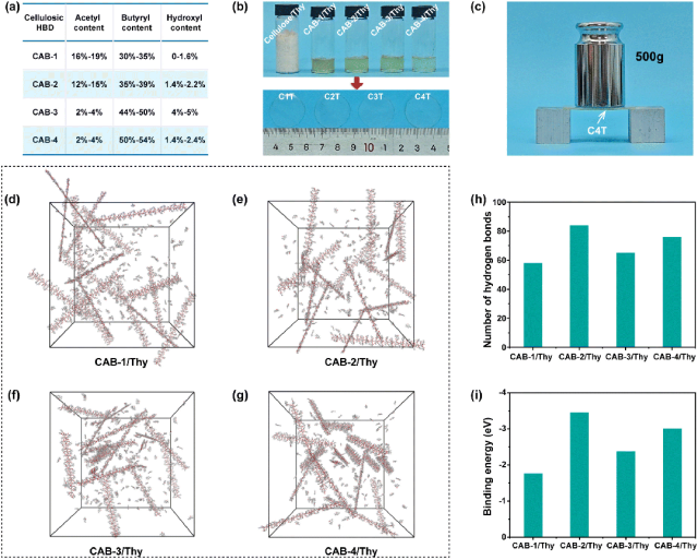 图2. CAB分子结构对聚合物-小分子低共熔形成及性能的影响。(a) 四种CAB的分子参数(乙酰基、丁酰基、羟基含量)。(b) 热处理(120℃)结果对比:纤维素/Thy对照组未能形成熔体,而所有CAB/Thy组合均形成均匀液体(上图),冷却后凝固成薄膜(下图)。(c) 1毫米厚C4T薄膜承载500克负载时变形量可忽略。(d–g) 不同CAB/Thy组合分子动力学模拟过程的截屏。(h和i) 模拟计算得到的分子间作用能(h)与氢键数(i)。