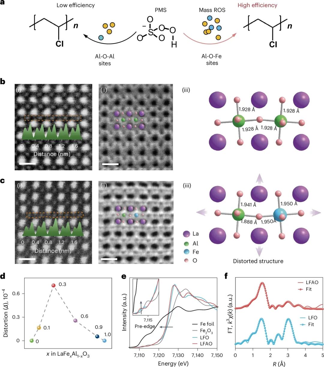 2.本文通过高分辨率透射电镜和能量色散X射线光谱进行了结构表征与元素分析。LFAO与LAO均暴露(012)晶面,但LFAO的晶格条纹(d=0.385 nm)相较于LAO(d=0.376 nm)发生扩张,这与X射线衍射结果一致。因比表面积相近,催化性能未受影响。拉曼光谱显示LFAO相较于LAO的A1g(152 cm−1)、Eg(463 cm−1)及另一Eg模式(691 cm−1)均发生蓝移,这可能与AlO6八面体畸变相关。为在原子尺度观测八面体畸变,本文分别采集了重元素阳离子(如Fe/Al)的高角环形暗场像与轻元素阴离子(如O)的环形明场像。HAADF图像中橙色矩形区域的线强度分布(图1b,c(ii)插图)证实孤立铁原子占据了铝原子在八面体中的位点。环形明场观测发现显著结构畸变:LFAO中氧阴离子相对标准LAO发生明显位移,导致键长键角显著改变(图1b,c(ii))。通过密度泛函理论模型获得的Al-O键长方差量化了这一畸变(图1b(iii)),发现其随铁含量增加呈火山形变化(图1d)。LFAO达到最大畸变值0.704,而LAO与LaFeO3均为无畸变的对称结构。值得注意的是,PMS活化速率(KPMS)随铁含量增加同样呈现火山形曲线。因此,通过简单调控结构畸变即可精确设定KPMS的定量关系。