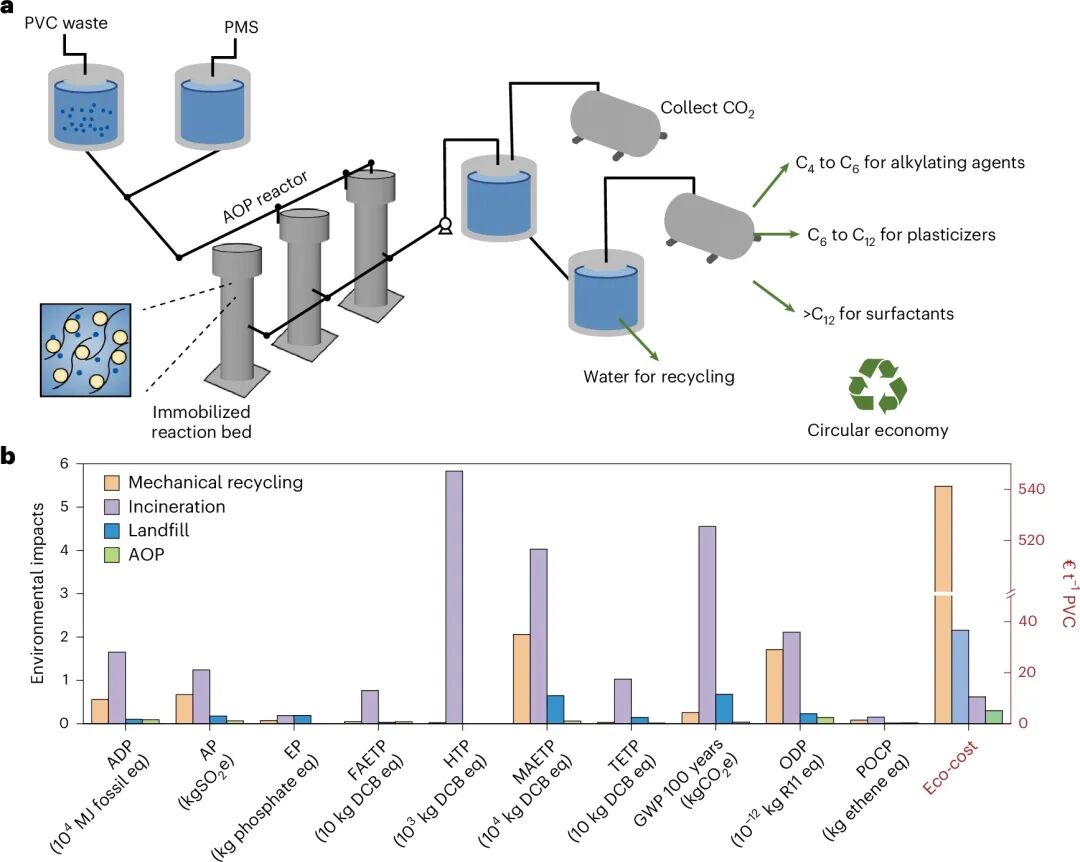 2.相较于传统工艺,LFAO/PMS高级氧化工艺在环境条件下使用可再生催化剂,能降低物料与化石能源消耗。该工艺在所有影响类别均保持较低水平,表明其对人类健康、生态系统和资源的负面影响小于传统工艺。此外,高级氧化工艺展现出更优的环境绩效,其全球变暖潜势较其他三种对比工艺降低45-99%。进一步选取五项中点指标(酸化潜势、富营养化潜势、淡水水生生态毒性潜势、全球变暖潜势和光化学臭氧生成潜势)汇总为单一生态成本,以量化环境损害的经济价值(图5b)。高级氧化工艺(5.05欧元)的生态成本较传统工艺(10.47-541.18欧元)降低51-99%。因此,LFAO/PMS工艺通过同步降低物料能源消耗并提升液态产物可回收性,实现了更高可持续性。该工艺为工业级PVC解聚优化提供了技术指引,有望助推可持续与零污染未来的建设。