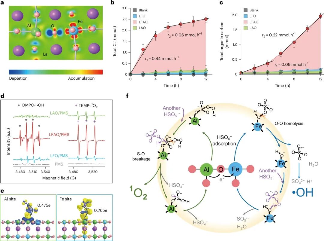1.本文通过XPS与差分电荷密度分布(图3a)直观展示了铝原子中的电子发生离域并通过氧桥向相邻铁原子迁移过程,形成贫电子区与富电子区双重活性位点,从而构建出具有高电子转移能力的理想氧化还原位点。此外,当铁位点被硫氰酸钾毒化后,催化活性显著抑制,由此推断LFAO材料的高性能源于铁、铝位点的协同效应。