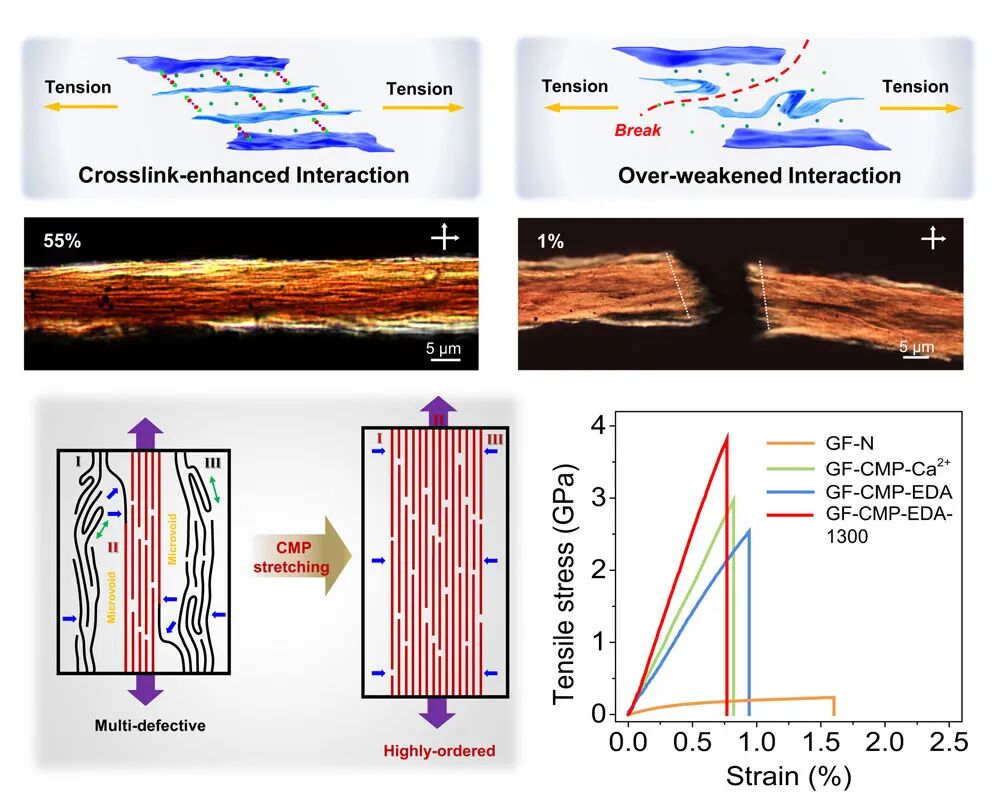 TOC. 展示交联调控可塑化(CMP)如何在拉伸中同时提升片层取向与承载,得到高强高导的石墨烯纤维