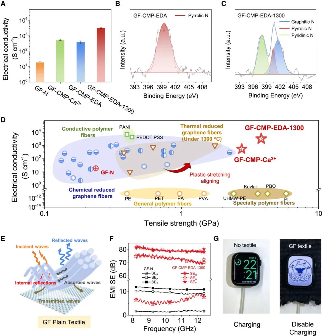 作者揭示了二维片层组装体在塑性加工中的一种与传统相反的机制:通过增强层间交联而非削弱相互作用,可在不牺牲承载力的前提下显著放大塑性变形窗口。该“交联调控可塑化”使GO片层在拉伸中实现有效去皱、轴向重排与晶格优化,从微结构上最小化皱褶与微孔等关键缺陷,进而提升载荷传递效率与电荷传输连续性。结合化学/热还原后,所得石墨烯纤维同时具备超高强度与高电导两大核心指标,并在编织织物中表现出以吸收主导的优异电磁屏蔽性能。该工作不仅加深了对二维纳米片层可塑化本质的理解,也为面向规模化的高性能湿法纺丝碳基纤维提供了可复制的工艺范式,具有明确的工业放大与应用前景(如高比强度导体、柔性互联与轻质EMI防护等)。