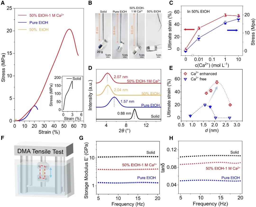 图2. 应力–应变、XRD与DMA证明Ca²⁺/EDA交联下伸长率最高可达55%,在相近层间距下仍实现强度回升与应变硬化