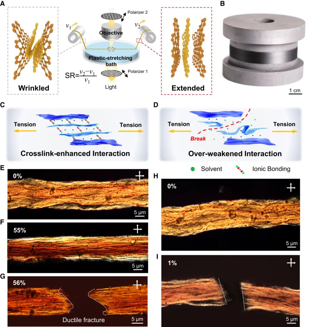 湿法纺丝的石墨烯氧化物(GO)液晶能组装成连续宏观纤维,为兼具高强度与导电性的碳基纤维开辟了新路径。然而,低浓度纺丝导致的巨大体积收缩、皮化效应与不均匀毛细压缩,会在纤维内残留大量皱褶与微孔,显著削弱载荷传递与导电网络;即便后续化学/热还原,强度仍远低于理想单层石墨烯。过去提升“可塑化”能力的常规思路,是向层间插入溶剂/寡聚体以“削弱层间作用”,从而在后拉伸中抚平皱褶、提高取向——但副作用是承载能力骤降、连续拉伸易断,塑性提升也有限。本文提出一种反直觉的“交联调控可塑化(CMP)”策略:在可塑化浴中引入二价/多价金属离子或有机交联剂,一边提供层间滑移所需的润湿与解缠,一边通过离子键桥联增强层间承载,从而实现“越拉越整齐、越整齐越能拉”的正反馈,最终在同一工艺窗口内同时提高塑性与强度,并显著改善电学性能与电磁屏蔽应用表现。