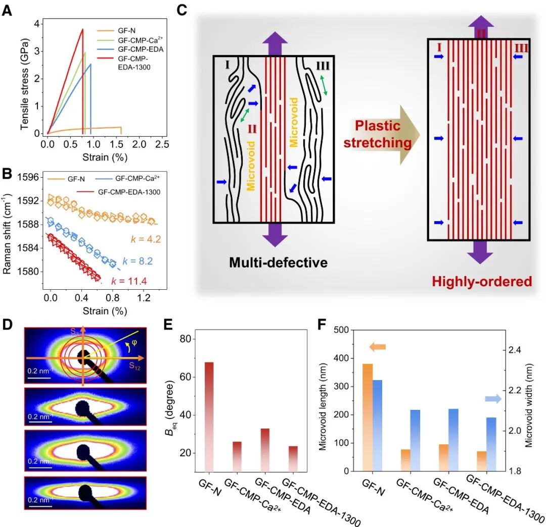 1. 交联促塑而不减承载。在50%乙醇-1 M Ca²⁺浴或8 wt%乙二胺(EDA)浴中进行近固态塑性拉伸,GO纤维的断裂伸长可达55%,显著高于传统削弱层间作用的方案;交联同时提升瞬时强度与应变硬化,使连续大比率单步拉伸成为可能。2. 去皱+取向+去缺陷的协同。MD与原位表征表明,交联键在拉伸中沿纤维轴向重新取向,驱动片层去皱与对齐、填充并“拆分”原生微孔;傅里叶-TEM/ WAXS 给出取向因子最高至 ~0.94–0.96,SAXS 定量显示微孔长度、体积分数与失配角均显著降低。3. 力学-电学双高点。化学还原后纤维强度达2.54–2.75 GPa;经1,300 °C热处理的EDA交联样(GF-CMP-EDA-1300)强度达3.81 GPa、杨氏模量~510 GPa、电导率3.23×10³ S cm⁻¹,并织造成织物后在X波段展现平均约79.5 dB的EMI屏蔽效能。