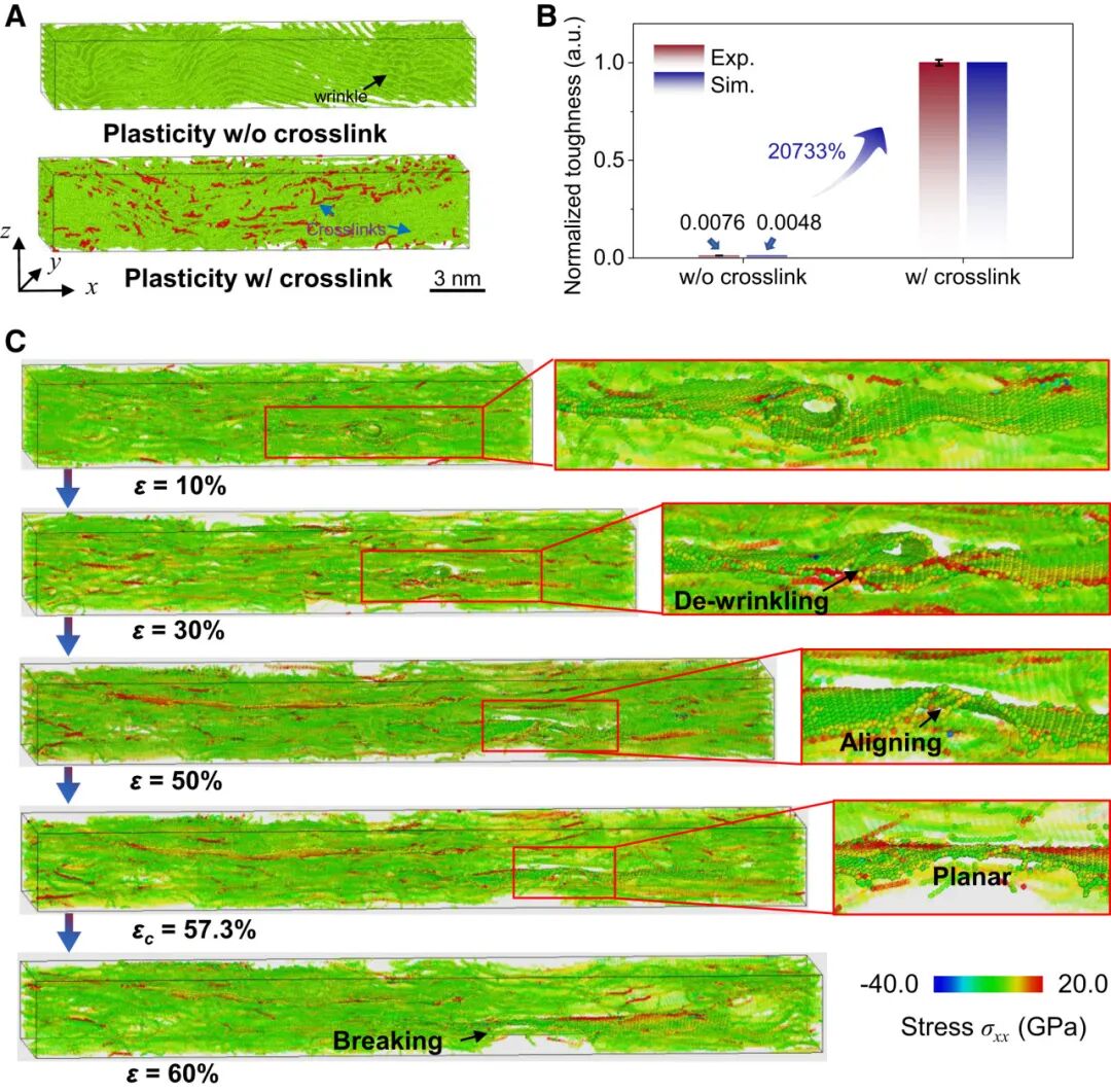 图3. 分子动力学模拟显示交联键随拉伸重排并牵引片层去皱对齐,使韧性提升两个数量级、断裂应变~57%