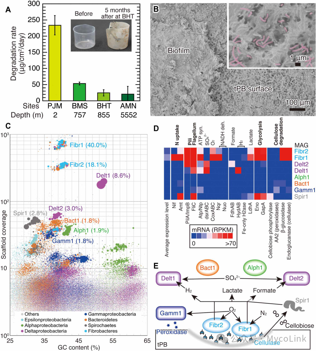 为验证其环境适应性,研究者在日本相模湾及西太平洋多深度海域布放样品,深度从2米到5552米。结果显示tPB在深海的降解速率虽为浅海的十分之一,但仍可在约300天内完全分解。表面形成富含Fibrobacteres的微生物群落,代谢分析揭示其分泌纤维素酶与β-葡萄糖苷酶分解tPB结构,并伴随硫酸盐还原与固氮过程,维持深海生态循环。即便材料意外进入海洋,也能在生态系统中被自然降解而不积累。