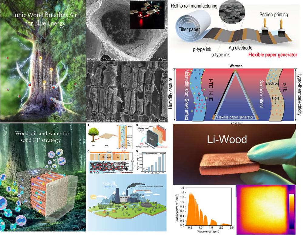 Most biobase trees or herbs contain abundant vertically arranged top-down microchannel structures that help drive efficient transport of oxygen, water molecules, electrons, and ions. We are committed to the structure of agricultural and forestry biomass and its soluble preparation strategy, construct green ion and electron transport structure through surface manipulation technology, and actively explore its role in green electronics, green catalysis, green energy. Taking environmental pollution control as an example, we take advantage of the porous structure of porous natural wood, and construct rapid ion, O2 and water molecule transport structures on the surface of the cavity wall through photopolymerization and frozen salting out technology, which can not only replace the traditional liquid electrolyte and expensive ion exchange membrane, but also construct a new solid-state electric Fenton strategy. High concentration H2O2 and strong oxidizing OH• (REDOX potential ~ 2.8V) are continuously and efficiently generated, which can quickly decompose most of the water, gaseous organic pollutants, viruses, bacteria and other organic matter, and generate non-toxic products. In addition, we also prepared high-strength wood aerogel through the soluble strategy of cellulose on the surface of natural wood cell wall, and constructed a spider-like network of Li+ and water molecule rapid transport structure on the surface of cell wall through controlled frozen salting out, which could spontaneously and efficiently breathe air and water molecule charge and discharge. A breakthrough has been made in electricity generating capacity, stability, charging and discharging of moisture gas. In addition, we also use cellulose paper to print a layer of dual-function ion-electron transport structure to construct a fully printed flexible paper damp-heat generator, which relies on the collaborative mixing of environmental moisture and waste heat to produce damp-heat energy. In ordinary humid and thermal environments, it produces an unconventional mode of humid and thermal electrical output, and shows an increase of almost ten times compared to conventional thermoelectricity. The emerging strategy of generating wet heat from surrounding wet heat resources offers a revolutionary approach to the next generation of hybrid energy, providing cost effectiveness, flexibility and sustainability, and enabling large-scale roll-to-roll production.