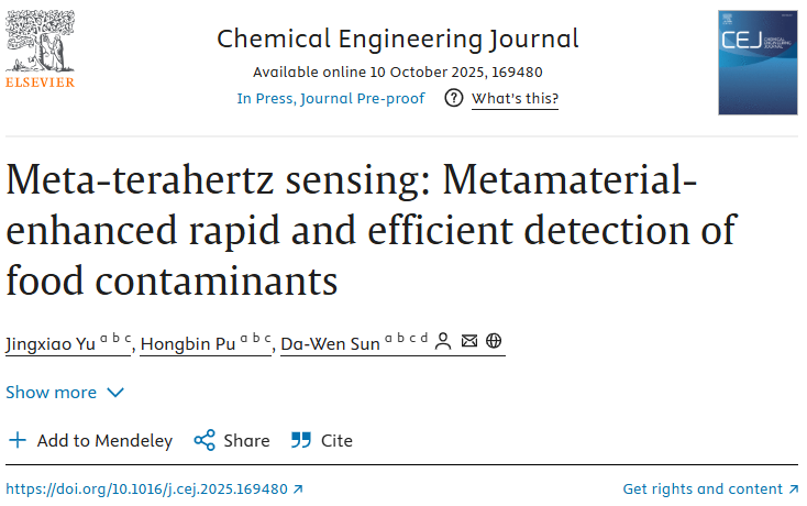 近日,华南理工大学现代食品工程研究中心孙大文院士团队以“Meta-terahertz sensing: Metamaterial-enhanced rapid and efficient detection of food contaminants”为题,在《Chemical Engineering Journal》(IF2024:13.2,JCR一区,中科院一区Top)期刊发表了综述性论文。华南理工大学孙大文院士为本文唯一通讯作者,华南理工大学蒲洪彬副教授为论文共同作者,论文第一作者为华南理工大学博士研究生余静孝。