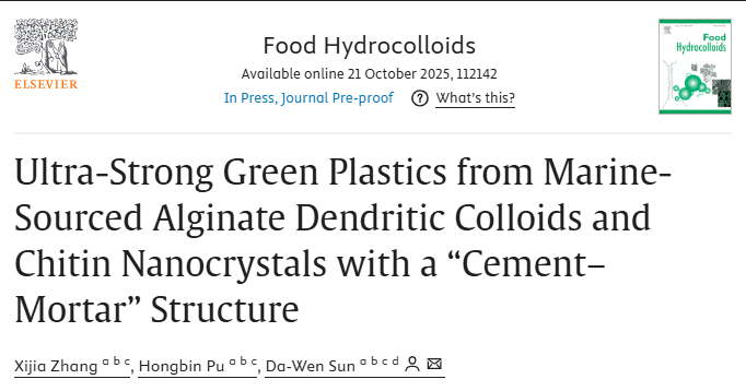 近期,华南理工大学现代食品工程研究中心孙大文院士团队在国际期刊《Food Hydrocolloids》(Q1,中科院1区,IF2024=12.4)发表了题为“Ultra-Strong Green Plastics from Marine-Sourced Alginate Dendritic Colloids and Chitin Nanocrystals with a “Cement–Mortar” Structure”的研究论文(DOI:10.1016/j.foodhyd.2025.112142)。华南理工大学孙大文院士为唯一通讯作者,第一作者为博士研究生张夕佳。