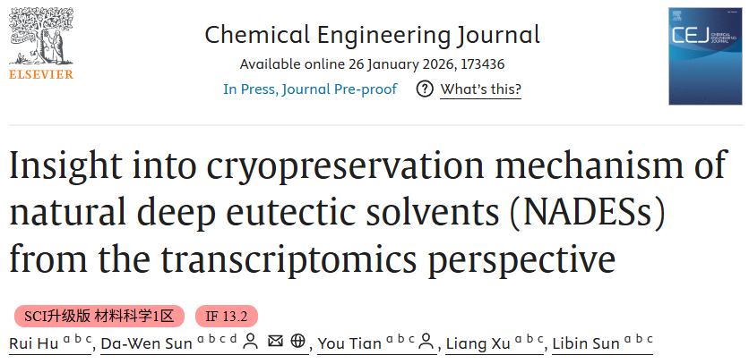 2026年1月,华南理工大学现代食品工程研究中心孙大文院士团队在国际期刊《Chemical Engineering Journal》(IF=13.2,JCR1区,中科院1区Top)发表题为“Insight into cryopreservation mechanism of natural deep eutectic solvents (NADESs) from the transcriptomics perspective”(DOI:10.1016/j.cej.2026.173436)的研究型论文。该文通讯作者为华南理工大学食品科学与工程学院孙大文院士、田由副研究员,第一作者为博士研究生胡瑞。