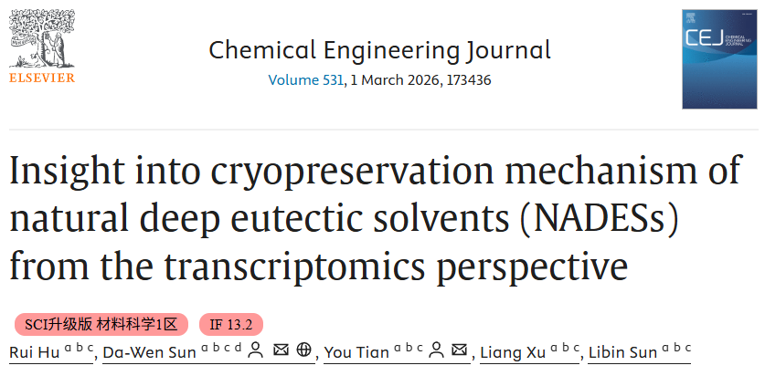 2026年1月,华南理工大学现代食品工程研究中心孙大文院士团队在国际期刊《Chemical Engineering Journal》(IF=13.2,JCR1区,中科院1区Top)发表题为“Insight into cryopreservation mechanism of natural deep eutectic solvents (NADESs) from the transcriptomics perspective”的研究型论文。该文通讯作者为华南理工大学食品科学与工程学院孙大文院士、田由博士后副研究员,第一作者为博士研究生胡瑞。