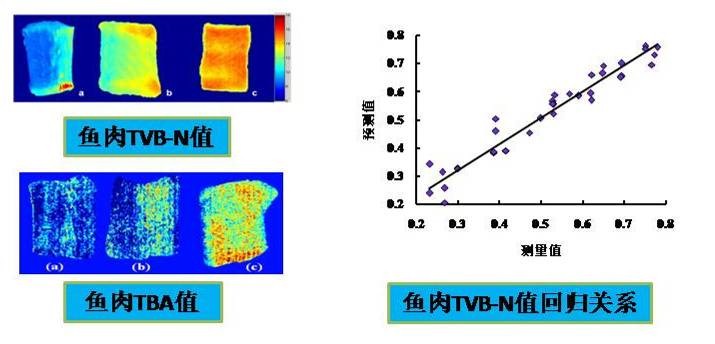 以草鱼为研究对象,探明了冷藏过程中鱼肉腐败过程生化变化(K值)、脂肪氧化(TBA)和蛋白质降解(TVB-N)等与光谱成像特征的关系,发明了鱼肉挥发性盐基氮等3种新鲜度指标的鱼身全域分布可视化方法,其相关性达到0.9以上(如图5所示)。