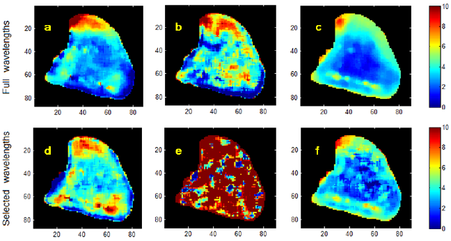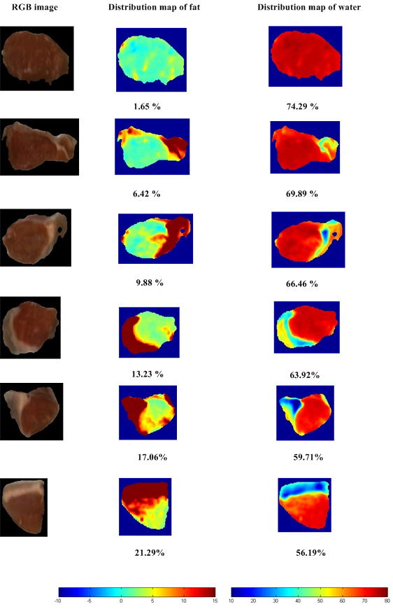 针对我国水产品和大宗肉品生产过程品质安全快速检测技术缺乏的难题,开展了猪肉冷藏过程中微生物菌落数预测研究,对猪肉冷藏过程的微生物变化过程进行了研究。建立了基于近红外高光谱成像的猪肉腐败菌菌落总数快速检测方法,实现了冷藏过程中猪肉腐败菌菌落总数时序可视化监控。开展了基于光谱成像的冷冻鸡肉菌落数检测研究,通过对光谱预处理建立了RF-PLSR,AF-PLSR和KMF-PLSR菌落数预测模型,并实现了鸡肉菌落分布可视化(如图2所示),鸡肉羟脯氨酸含量分布和不同饲养方式鸡肉快速检测。