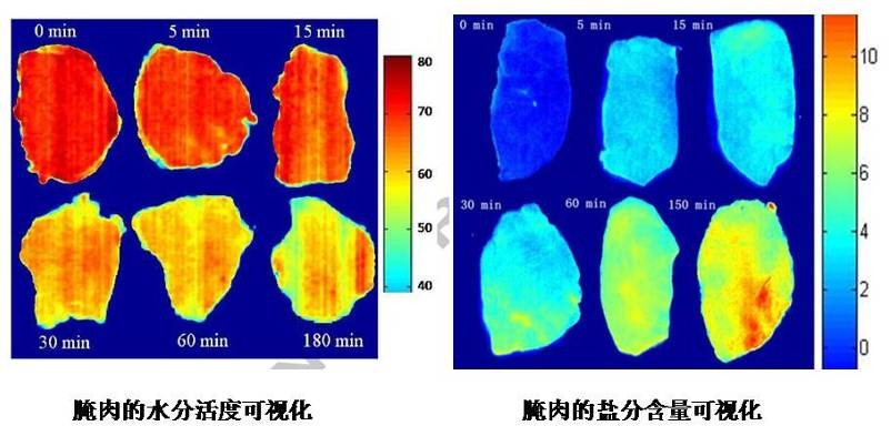 研究了基于高光谱成像的腌肉品质时序分析方法(如图3所示);建立了基于高光谱的羊肉掺假快速鉴别方法;建立了基于特征波谱图像小波纹理的鲜-解冻猪肉鉴别方法,该研究被SCI期刊Meat Science作为2014全年特色文章之一予以报道。