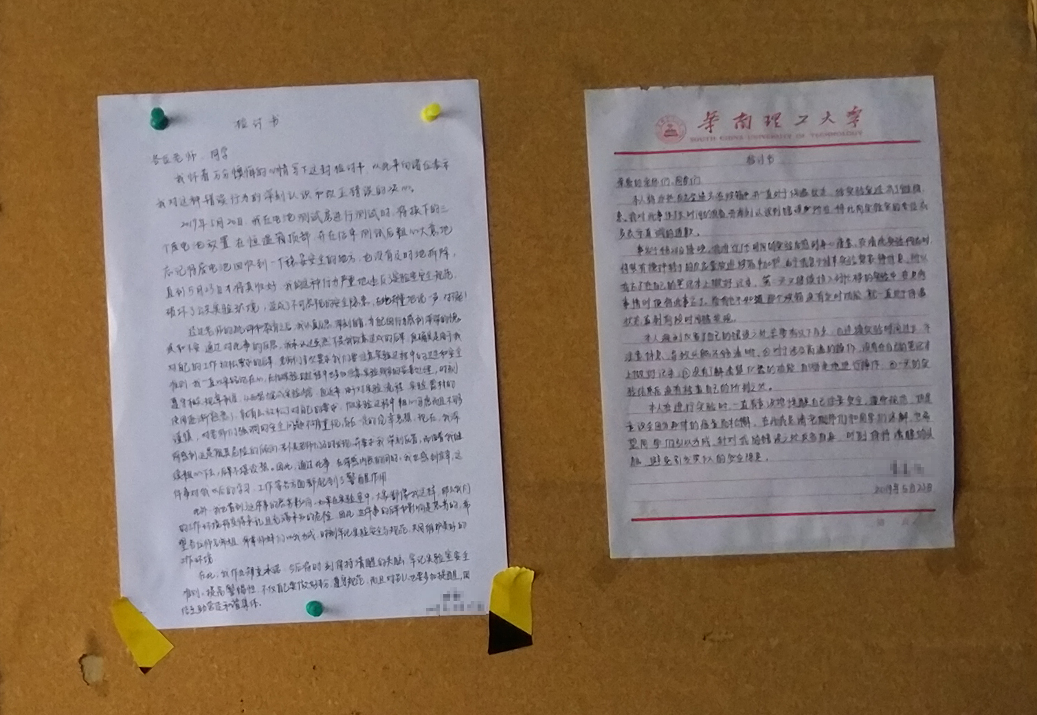 针对近期出现实验室卫生及安全问题同学的检讨书张榜并公示