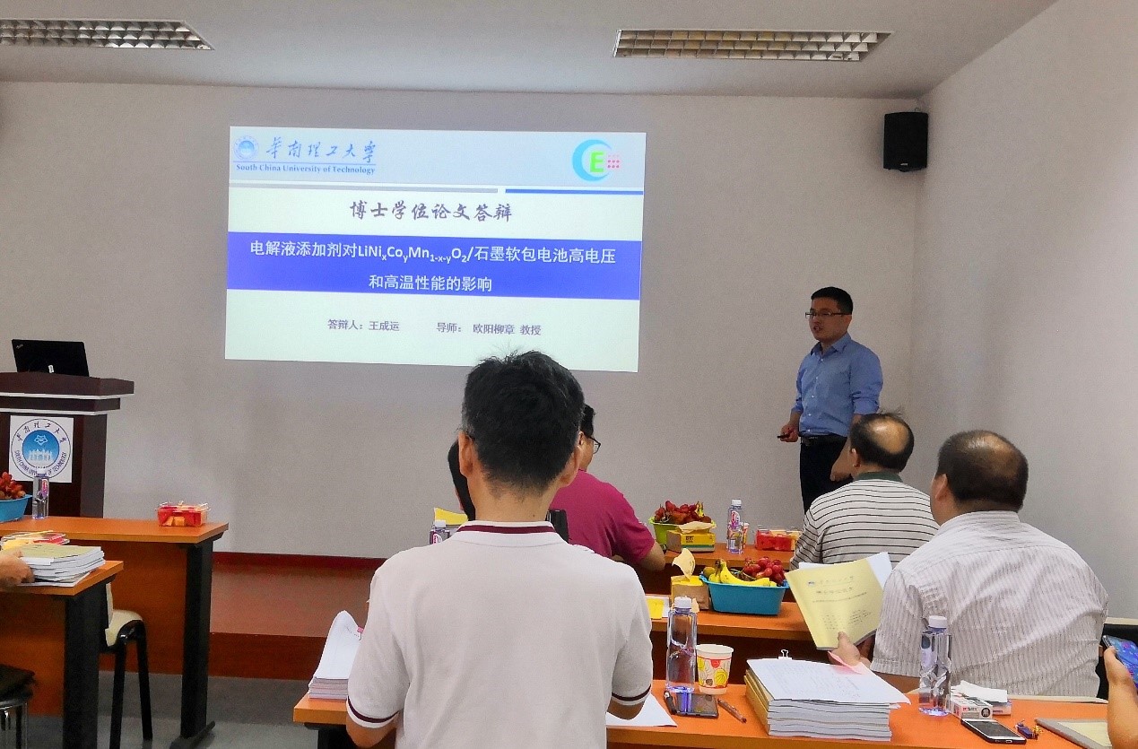 2019年6月1日,华南理工大学大学城校区B5楼3楼会议室举行王成运博士论文答辩会。王成运博士答辩的题目为“电解液添加剂对LiNixCoyMn1-x-yO2/石墨软包电池高电压和高温性能的影响”,指导老师为欧阳柳章教授。担任本次论文答辩委员会的主席是来自广东省科学院的刘敏教授级高工,委员有来自暨南大学的李卫教授,华南农业大学的刘应亮教授,华南师范大学的南俊民教授,华南理工大学的朱敏教授、王平教授、欧阳柳章教授。王成运博士以商业化的LiNi1/3Co1/3Mn1/3O2/石墨和LiNi0.5Co0.2Mn0.3O2/石墨软包电池高电压性能差,以及LiNi0.6Co0.2Mn0.2O2/石墨和LiNi0.8Co0.1Mn0.1O2/石墨软包电池高温条件下容量损失等问题为核心对其博士期间的工作进行了30多分钟的阐述,介绍了其博士期间在电解液添加剂设计对商用软包电池高温、高压性能的研究。报道1,2-双(氰乙氧基)乙烷(EDPN)作为正极成膜添加剂显著改善LiNi1/3Co1/3Mn1/3O2/石墨软包电池在4.5V充电截止电压下的循环稳定性和倍率性能;阐明了二氟磷酸锂(LiDFP)同时参与正负极界面膜的形成,拓宽了电解液的电化学窗口,提高了LiNi1/3Co1/3Mn1/3O2/石墨和LiNi0.5Co0.2Mn0.3O2/石墨软包电池的高电压性能,为LiDFP作为一种多功能锂盐添加剂应用奠定了理论基础;将2-甲基马来酸酐(CAn)作为负极成膜添加剂来提高电池的高温性能,阐明了由酸酐参与形成的富含Li2CO3组分的负极SEI膜缓解了LiNi0.6Co0.2Mn0.2O2/石墨软包电池高温过程阻抗增长和降低电池高温容量损失;将含有不饱和官能团的磷酸三丙炔酯(TPP)作为电解液添加剂用于改善LiNi0.6Co0.2Mn0.2O2/石墨和LiNi0.8Co0.1Mn0.1O2/石墨软包电池的高温性能,阐明了炔基的引入使TPP具有良好的还原特性并抑制电解液在负极界面的分解消耗。随后,答辩委员会对其博士学位论文进行了充分交流。答辩委员会充分肯定了王成运博士在博士期间扎实的工作与丰富的研究成果,并围绕其博士期间的工作与博士学位论文提出了宝贵的意见与建议。经过约一小时的答辩,王成运博士顺利通过博士论文答辩。