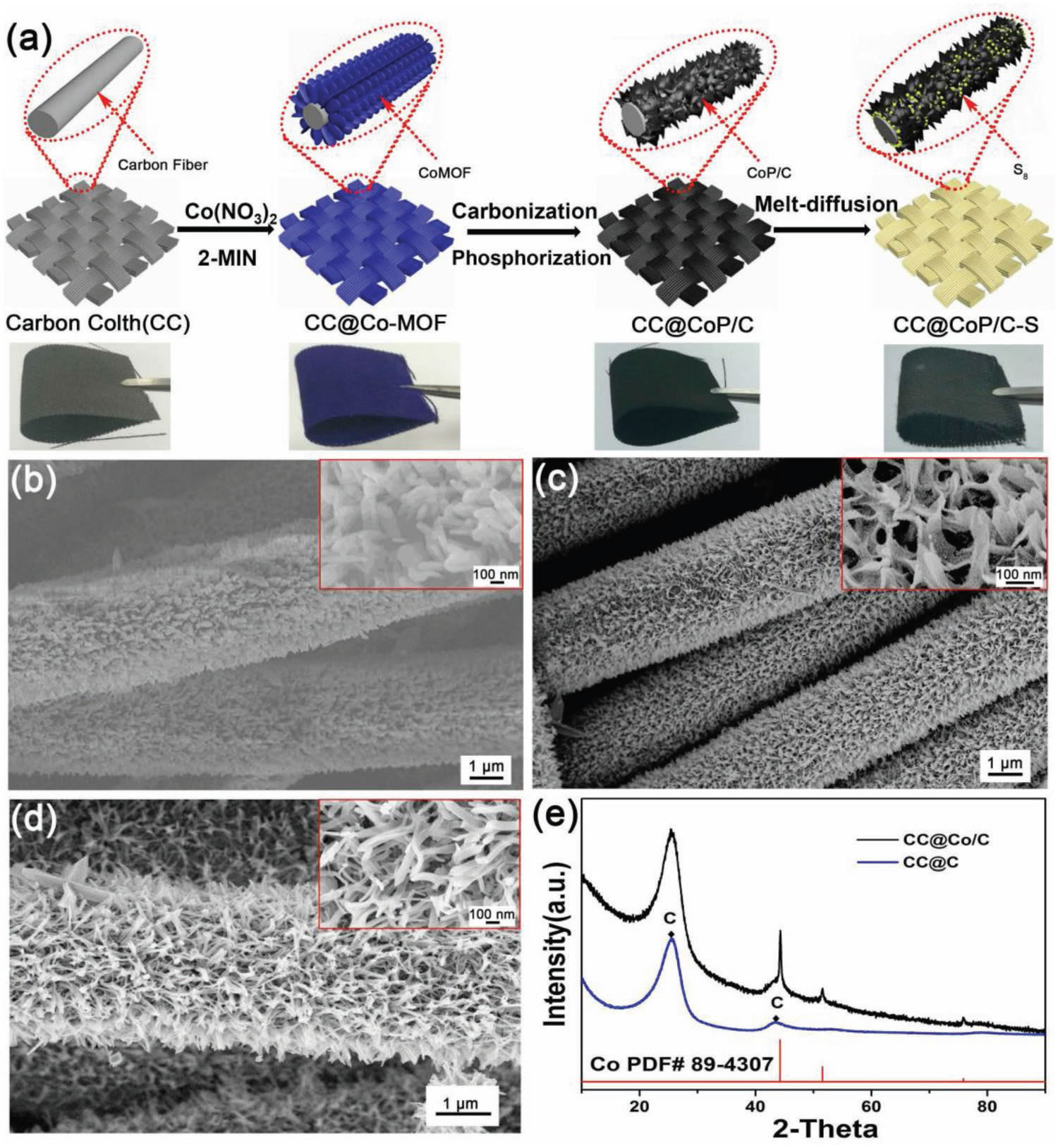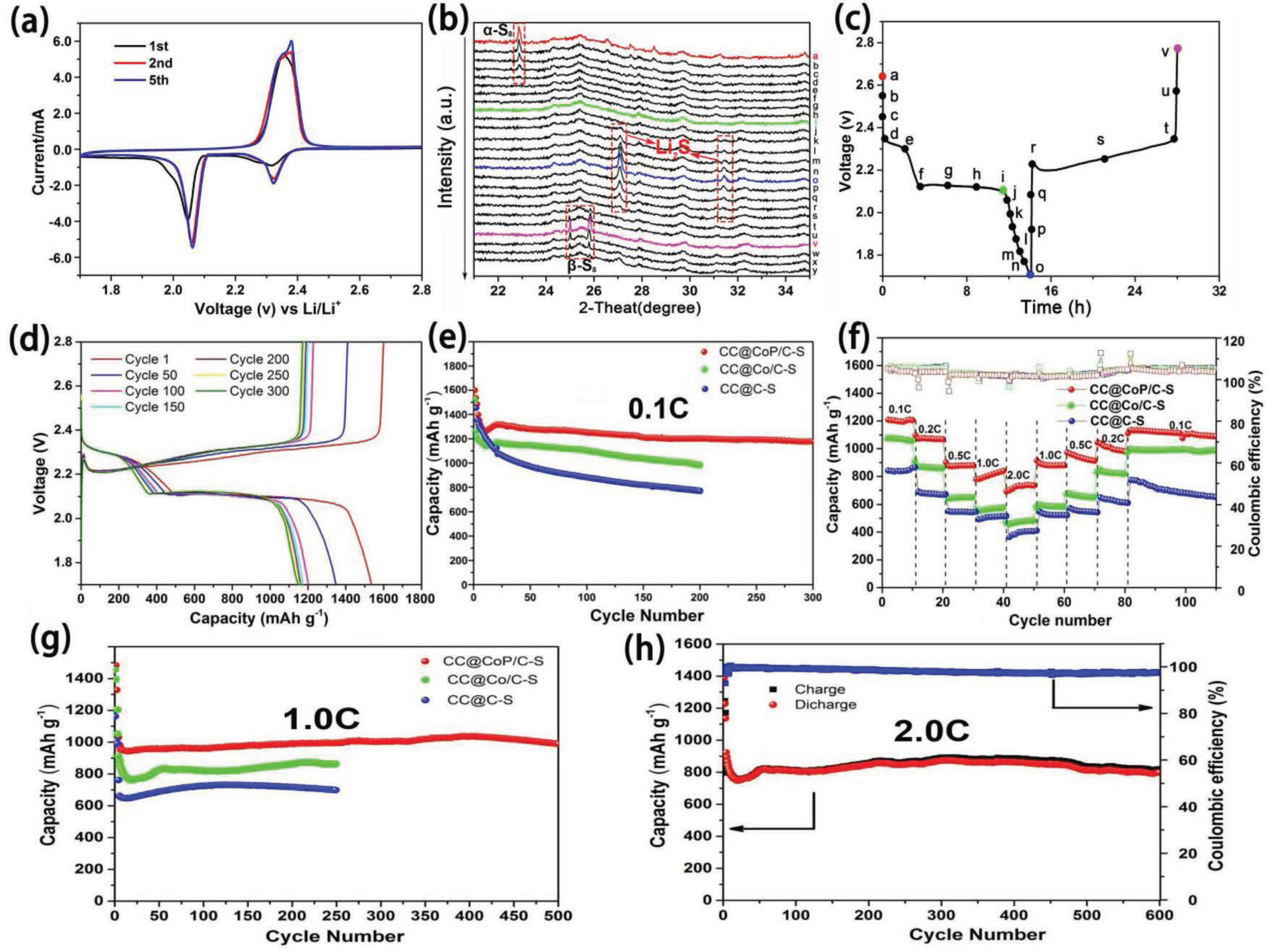 近日,本实验室王卓森博士在国际顶级期刊Advanced Materials (IF=25.809)上发表题为“基于双重协同限域效应的高比能自支撑柔性硫正极(Self-Supported and Flexible Sulfur Cathode Enabled via Synergistic Confinement for High-Energy-Density Lithium-Sulfur Batteries)”,报道了一种通过整合导电性碳布(CC),MOF 衍生的并负载有CoP的N掺杂的纳米片阵列(CoP/C)和电活性硫,合成了一种新型自支撑柔性硫正极CC@CoP/C-S。该结构对可溶性中间体LPS起到物理和化学吸附的协同限制,在不同的电流密度下展现出较高的比容量。该电池在2C电流密度下进行600次循环后,仍保持较大的比容量(833mAh/g)。