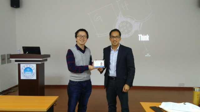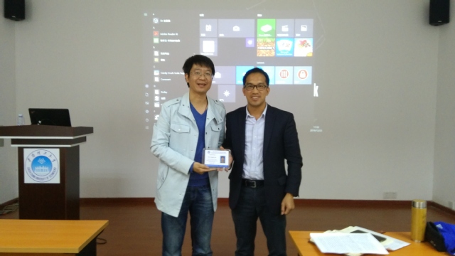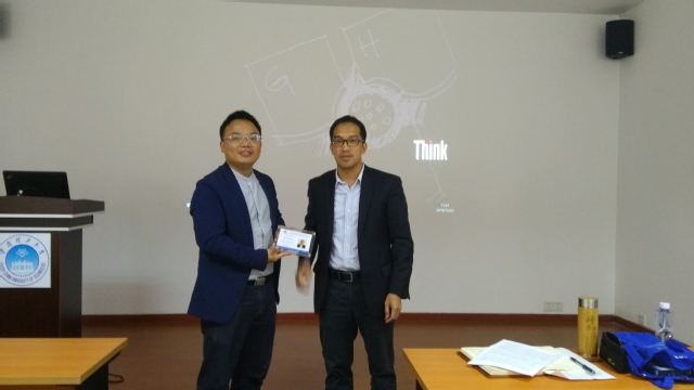 实验室胡仁宗教授(右)向吴飞翔教授(左)赠送实验室纪念牌