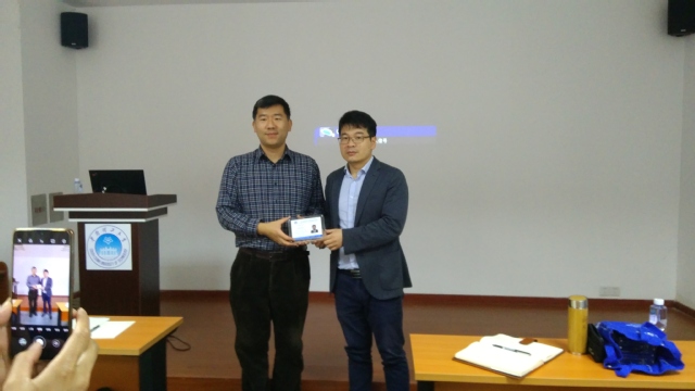 实验室胡仁宗教授(右)向朱昌宝教授(左)赠送实验室纪念牌