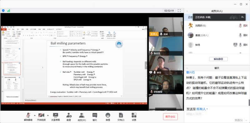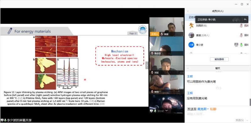 2020年4月10日下午3时,本实验室首次开展线上学术活动,参与活动的实验室师生共计90余人。本次学术活动由袁斌教授主持,李少波博士后、许希军博士后和钟浩博士后分别为实验室师生介绍了等离子体,储电材料以及机械球磨领域的基础知识。会议共持续约2小时30分钟。