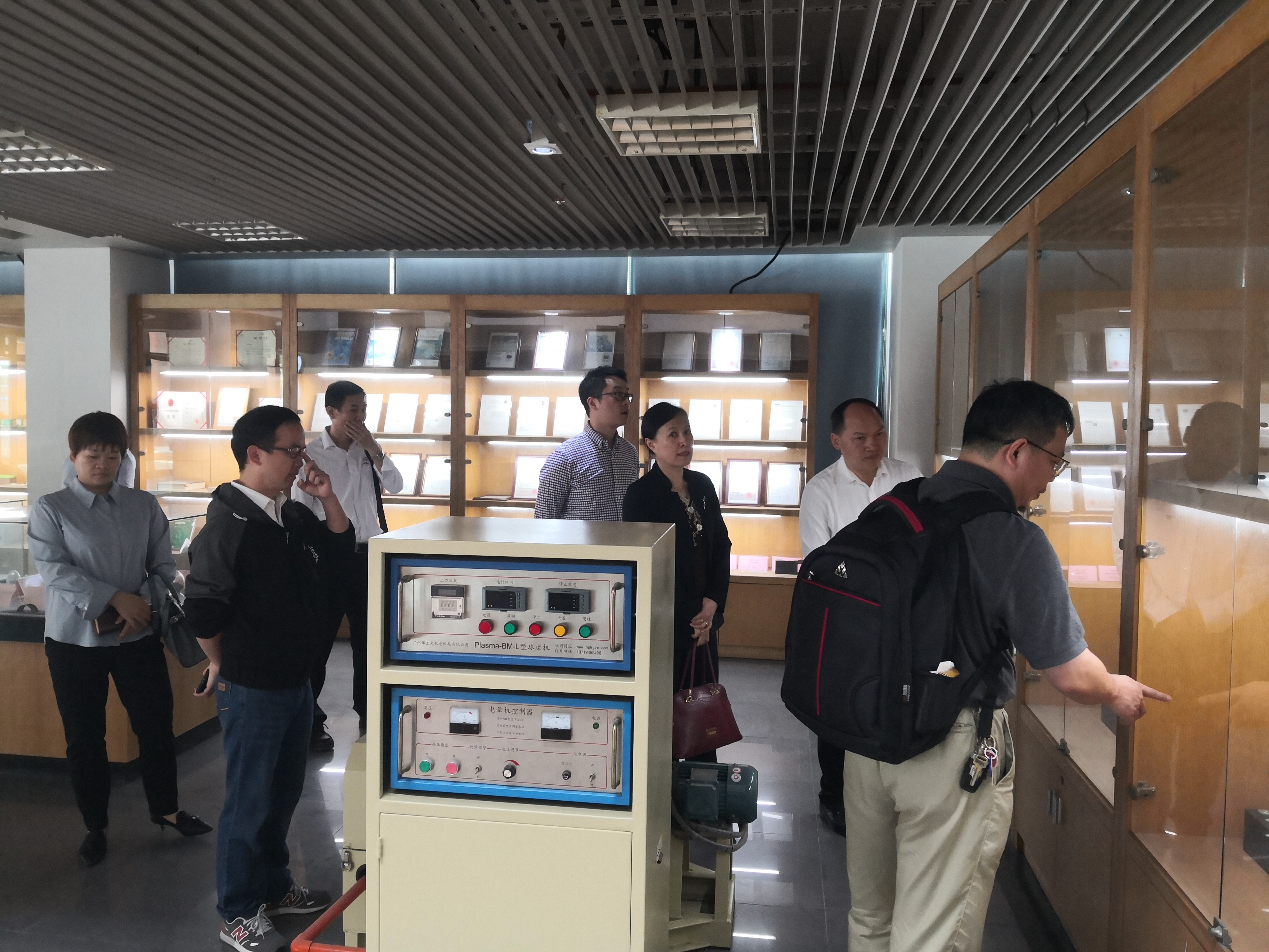 实验室鲁忠臣副教授正在向毛善文总经理一行介绍实验室硬质合金及等离子体球磨技术