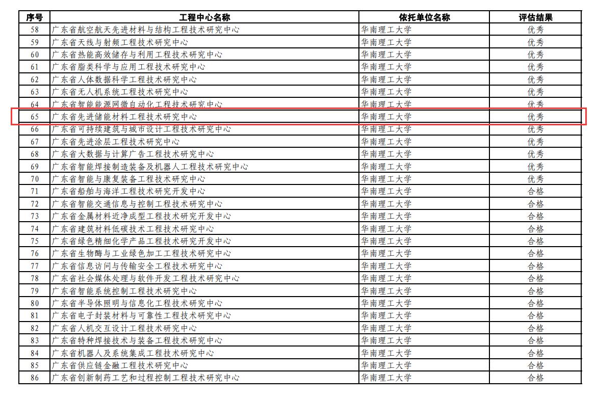 根据《广东省科学技术厅关于开展省级工程技术研究中心动态评估工作的通知》和《广东省科学技术厅广东省教育厅关于开展高校类省级工程技术研究中心动态评估工作的通知》,广东省科技厅对1991~2018年建设的5354家省级工程中心开展了动态评估工作。根据广东省科技厅的评估结果显示,广东省先进储能材料工程技术研究中心评估结果为优秀。