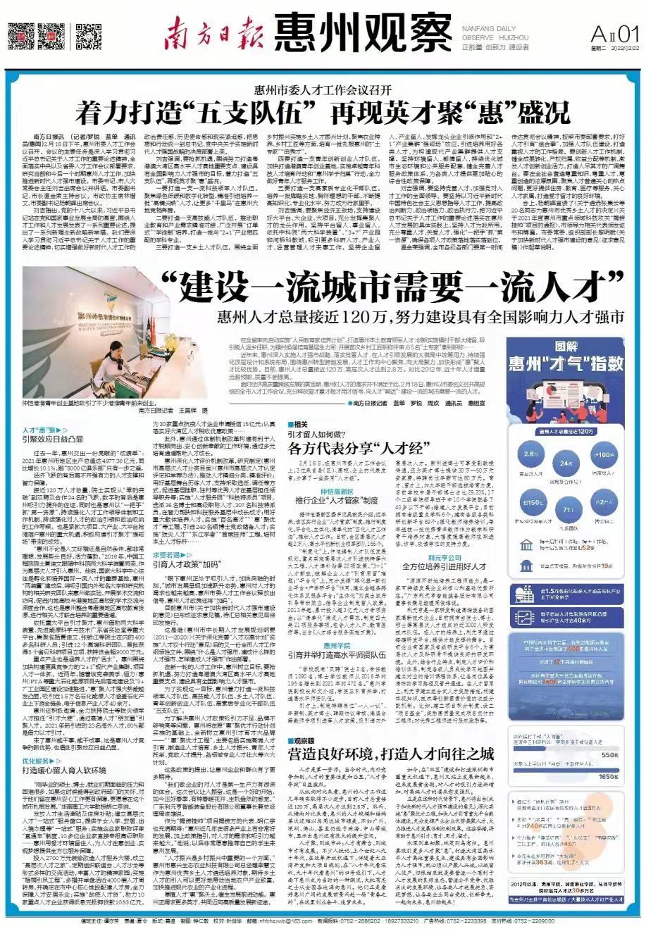 近年来,惠州深入实施人才强市战略,落实党管人才,在人才引领发展的大棋局中统筹用力,持续强化顶层设计和系统布局,围绕惠州转型跨越发展,人才工作向中心聚焦、向大局聚力,加快形成“惠”聚人才比较优势。目前,惠州人才总量接近120万,高层次人才达到2.8万。对比2012年,近十年人才增量远超预期,质量不断提高。