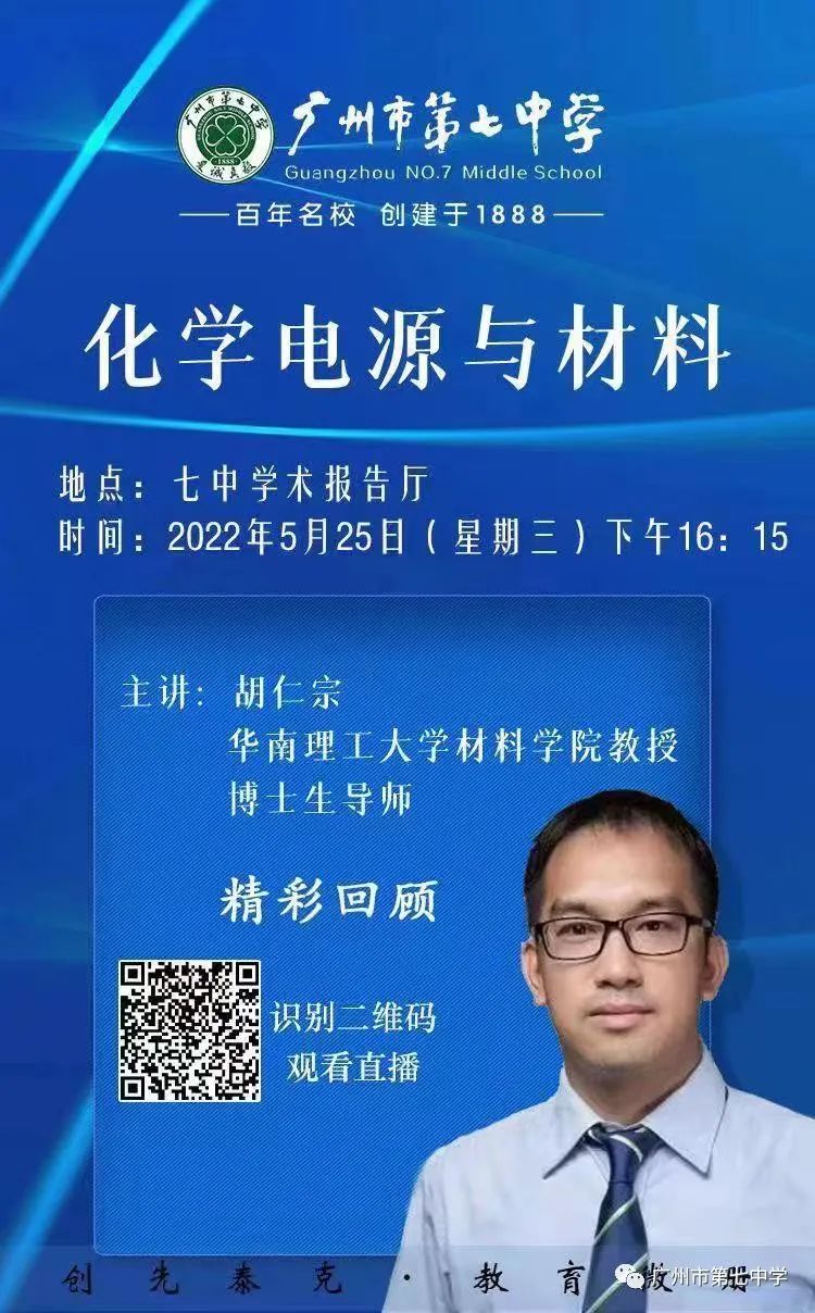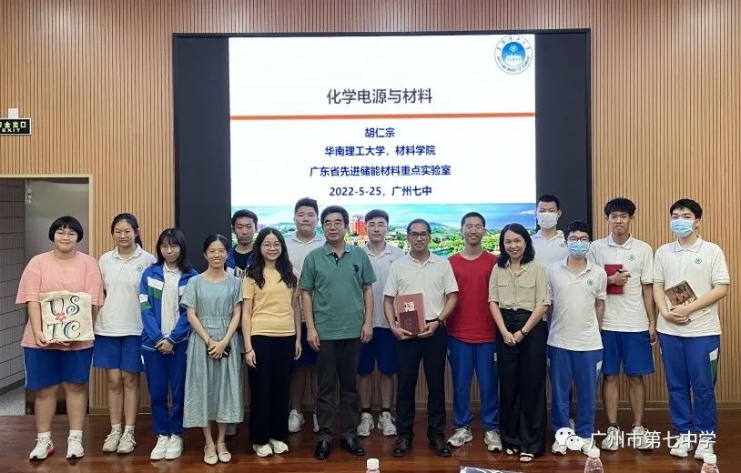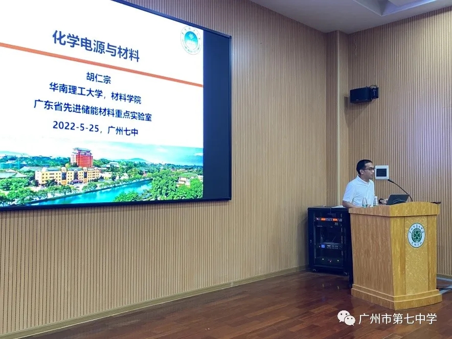 5月25日下午,实验室胡仁宗教授应广州市第七中学的邀请做了“化学电源与材料”的主题讲座给同学们科普关于锂电子电池的相关知识。胡仁宗教授从特斯拉电动车和2019年诺贝尔化学奖切入深入浅出地为同学们介绍了电池的基本知识、锂离子电池的构造、应用、安全性、研究进展等,强调了研发锂离子电池和电动车是我国目前的重要发展战略并鼓励同学们在未来继续攻坚克难,为电池事业的发展做出贡献。讲座结束,胡教授与同学交流讨论耐心答疑解惑。