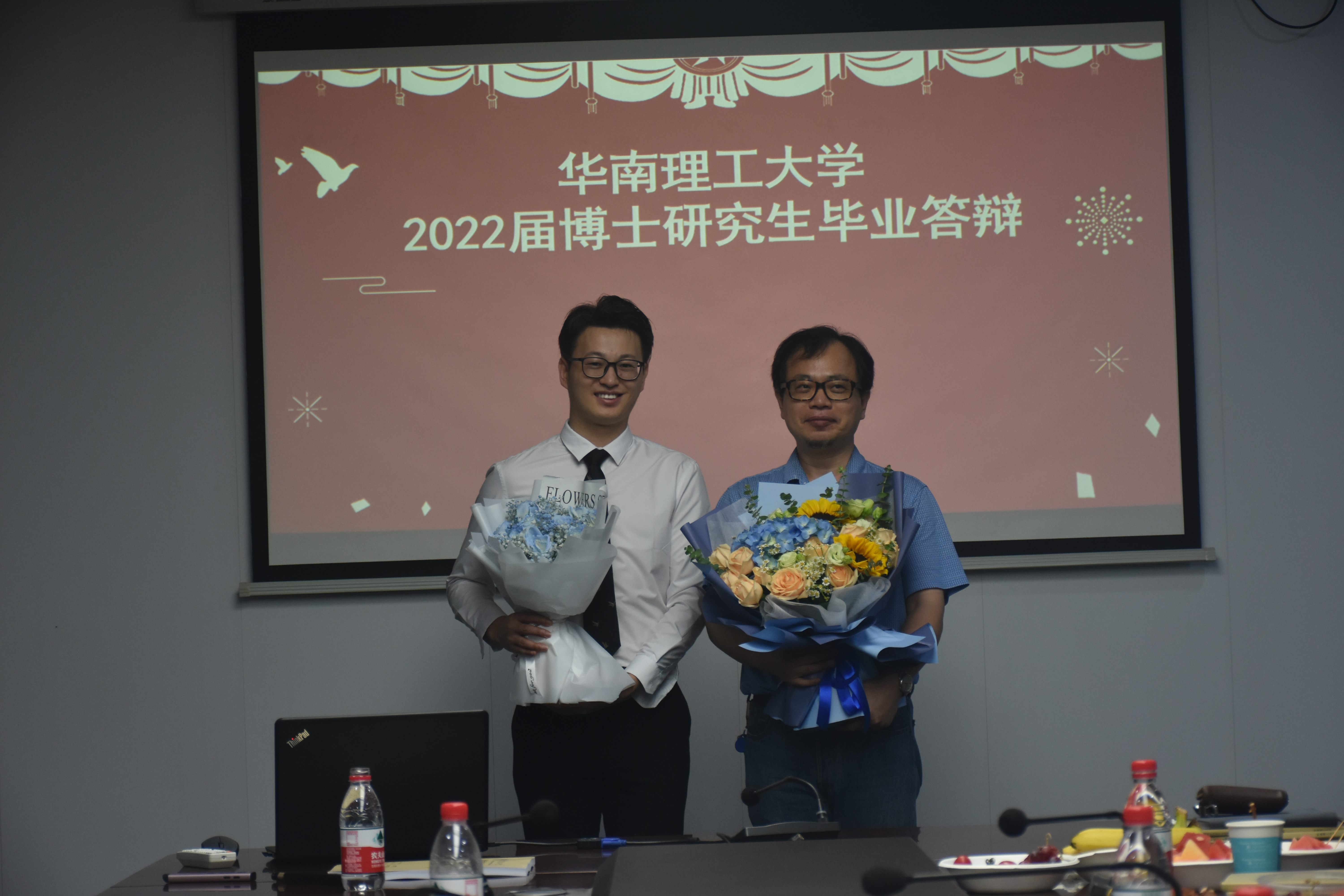 答辩委员会主席黄少铭教授祝贺陈康等三位博士研究生通过博士学位论文答辩