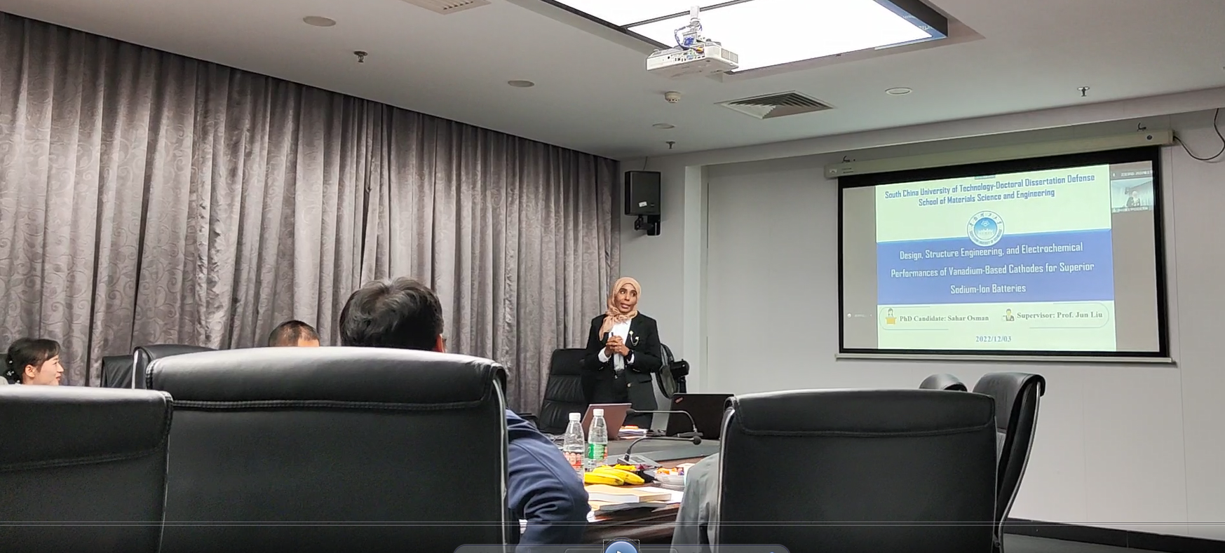 2022年12月3日,华南理工大学B5-102会议室举行了Sahar Osman等四位博士研究生的博士学位论文答辩。Sahar Osman博士答辩的题目为“高性能钠离子电池钒基正极材料的设计、结构调控和电化学性能优化”,指导老师为刘军教授。担任本次论文答辩委员会主席的是来自广州大学的牛利教授,委员有来自华南师范大学的兰亚乾教授,华南理工大学的朱敏教授、欧阳柳章教授、王辉教授、胡仁宗教授和刘军教授。来自华南理工大学的张洪明博士后担任答辩秘书。Sahar Osman博士用约40分钟的时间,分别从新型自支撑钒酸钠/MWCNTs、五氧化二钒和三氧化二钒三个角度对钒基阴极材料进行了研究,对其博士期间的工作进行了阐述。随后,答辩委员会对其博士期间的研究内容及博士学位论文进行了交流。各位委员充分肯定了Sahar Osman博士在攻读博士学位期间的工作成果,并围绕其博士学位论文提出了不少中肯的意见与建议。经过约一个小时的答辩,Sahar Osman博士顺利通过博士学位论文答辩。