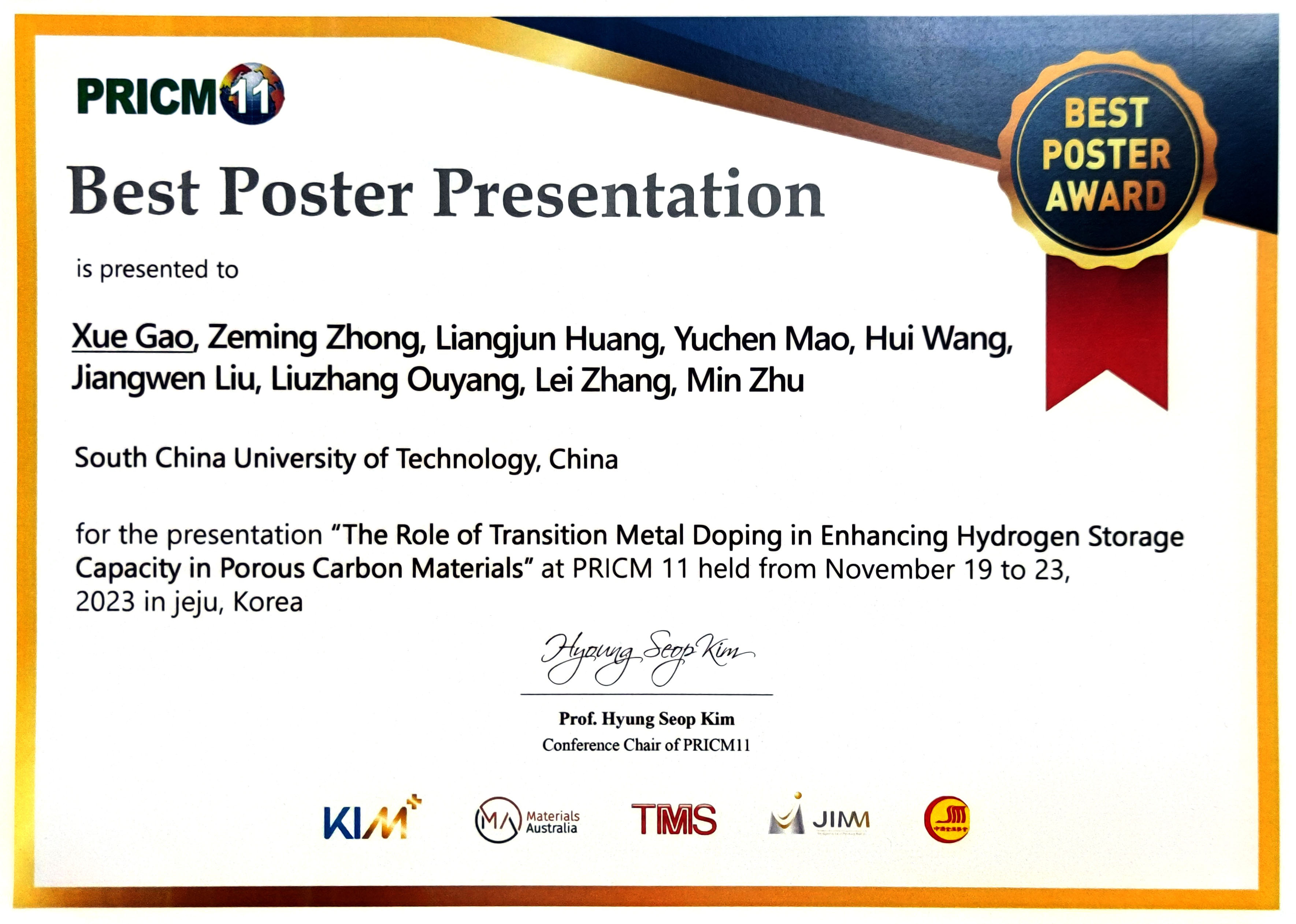 实验室朱敏教授作为分会主席受邀出席本次会议(分会场G:Materials for Energy Storage and Generation),欧阳柳章教授、胡仁宗教授及2021级博士生申少洋同学在大会上进行了精彩的口头报告;2019级博士生高雪同学题为“The Role of Transition Metal Doping in Enhancing Hydrogen Storage Capacity in Porous Carbon Materials”的研究成果获得最佳展示海报奖,导师为朱敏教授。